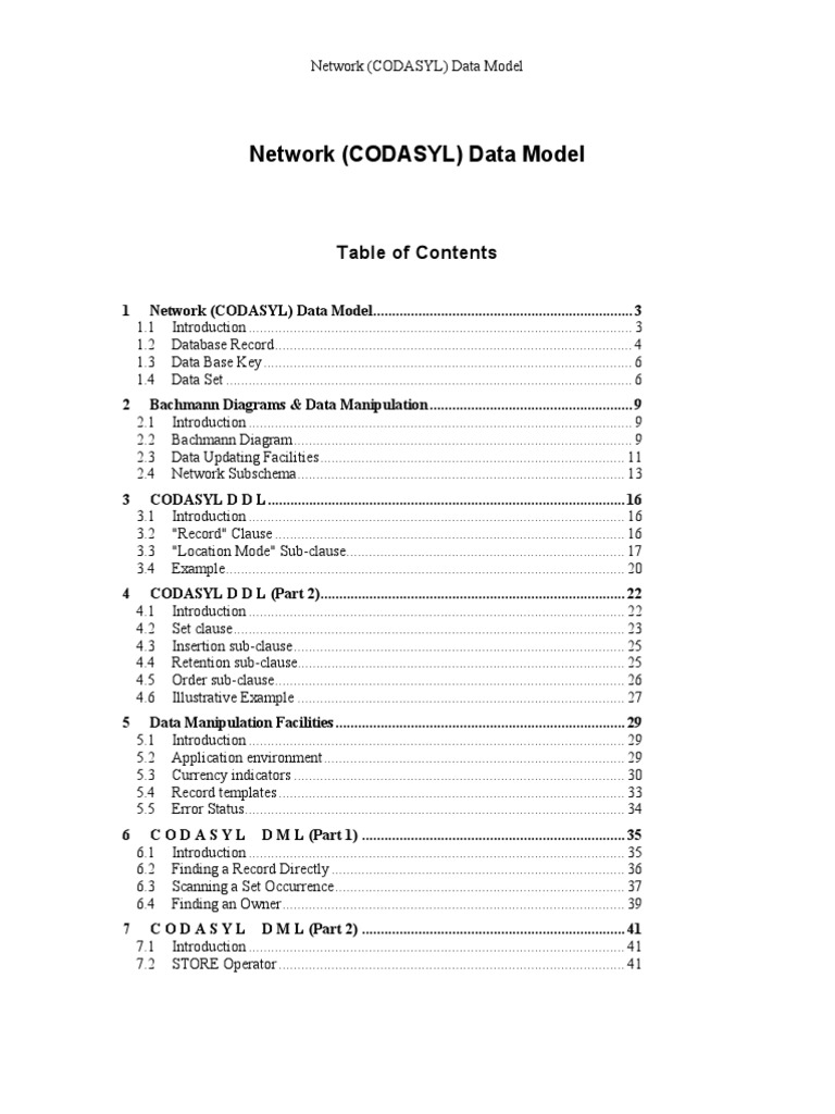 1 Network (CODASYL) Data Model..................................................................... 3 1.1 Introduction ...................................................................................................... 3 1.2 Database Record............................................................................................... 4 1.3 Data Base Key .................................................................................................. 6 1.4 Data Set ............................................................................................................ 6 Bachmann Diagrams & Data Manipulation...................................................... 9 2.1 Introduction ...................................................................................................... 9 2.2 Bachmann Diagram.......................................................................................... 9 2.3 Data Updating Facilities................................................................................. 11 2.4 Network Subschema....................................................................................... 13 CODASYL D D L............................................................................................... 16 3.1 Introduction .................................................................................................... 16 3.2 "Record" Clause ............................................................................................. 16 3.3 "Location Mode" Sub-clause.......................................................................... 17 3.4 Example.......................................................................................................... 20 CODASYL D D L (Part 2)................................................................................. 22 4.1 Introduction .................................................................................................... 22 4.2 Set clause........................................................................................................ 23 4.3 Insertion sub-clause........................................................................................ 25 4.4 Retention sub-clause....................................................................................... 25 4.5 Order sub-clause............................................................................................. 26 4.6 Illustrative Example ....................................................................................... 27 Data Manipulation Facilities............................................................................. 29 5.1 Introduction .................................................................................................... 29 5.2 Application environment................................................................................ 29 5.3 Currency indicators ........................................................................................ 30 5.4 Record templates ............................................................................................ 33 5.5 Error Status..................................................................................................... 34 C O D A S Y L D M L (Part 1) ...................................................................... 35 6.1 Introduction .................................................................................................... 35 6.2 Finding a Record Directly .............................................................................. 36 6.3 Scanning a Set Occurrence............................................................................. 37 6.4 Finding an Owner........................................................................................... 39 C O D A S Y L D M L (Part 2) ...................................................................... 41 7.1 Introduction .................................................................................................... 41 7.2 STORE Operator ............................................................................................ 41