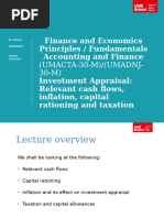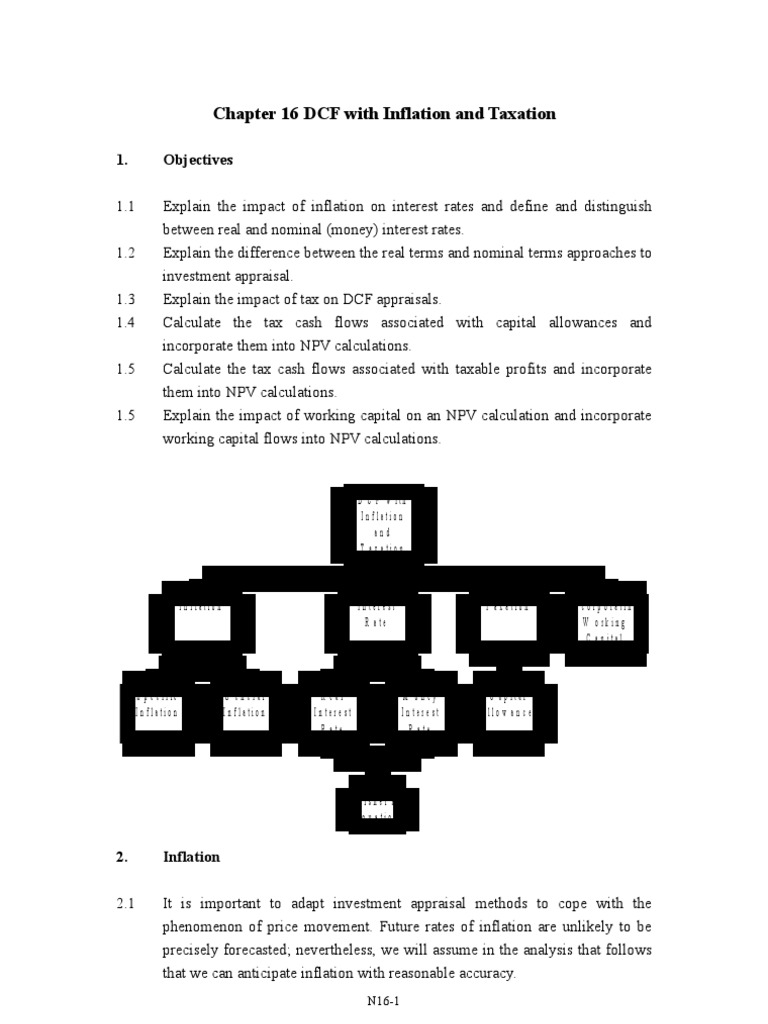 1. 1.1 1.2 1.3 1.4 1.5 1.5 Objectives Explain the impact of inflation on interest rates and define and distinguish between real and nominal (money) interest rates. Explain the difference between the real terms and nominal terms approaches to investment appraisal. Explain the impact of tax on DCF appraisals. Calculate the tax cash flows associated with capital allowances and incorporate them into NPV calculations. Calculate the tax cash flows associated with taxable profits and incorporate them into NPV calculations. Explain the impact of working capital on an NPV calculation and incorporate working capital flows into NPV calculations.
