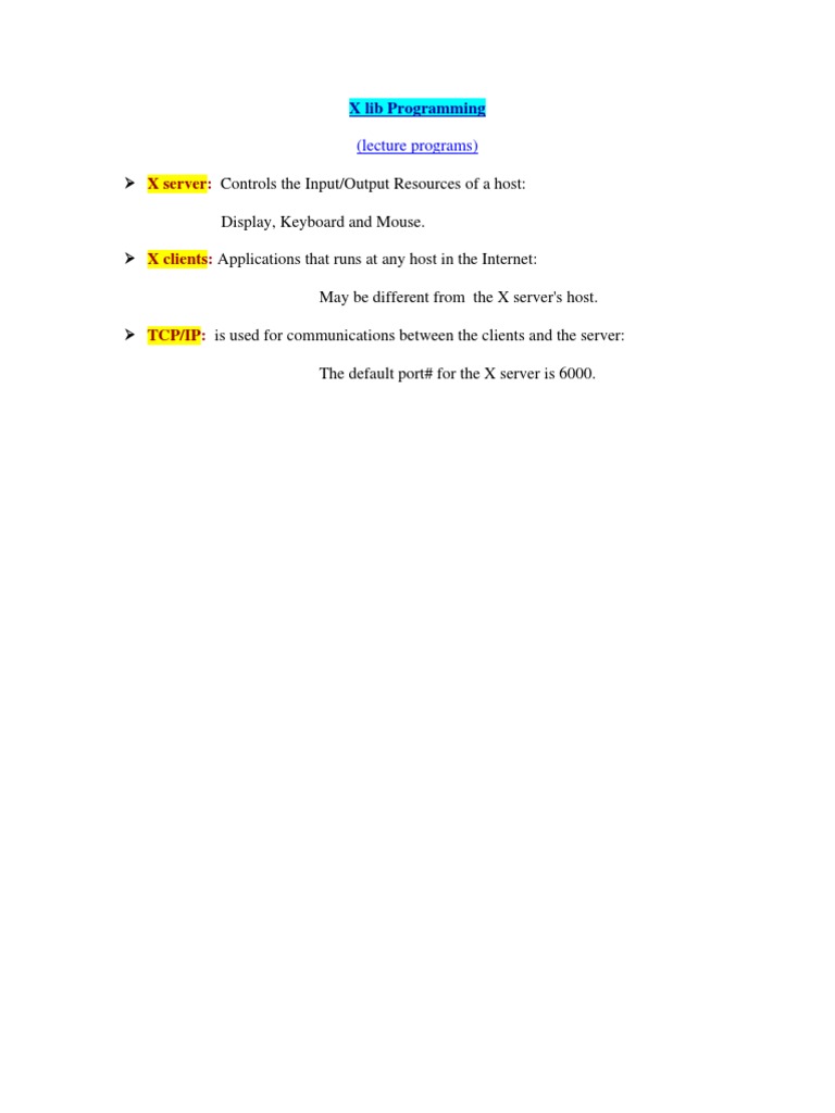 X lib Programming (lecture programs) X server: Controls the Input/Output Resources of a host: Display, Keyboard and Mouse.