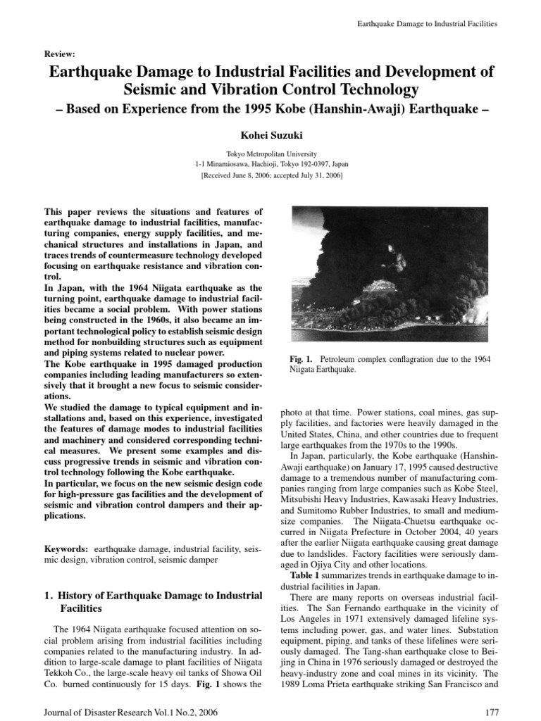 The 1964 Niigata earthquake focused attention on social problem arising from industrial facilities including companies related to the manufacturing industry. In addition to large-scale damage to plant facilities of Niigata Tekkoh Co., the large-scale heavy oil tanks of Showa Oil Co. burned continuously for 15 days. Fig. 1 shows the Journal of Disaster Research Vol.1 No.2, 2006