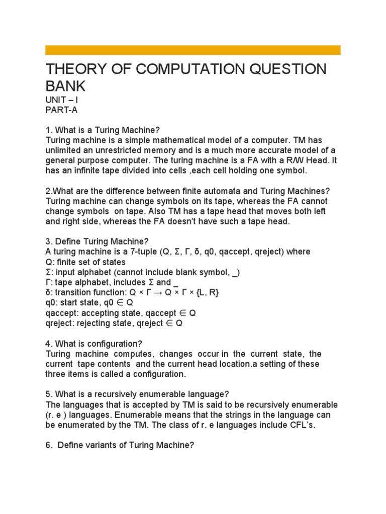 UNIT I PART-A 1. What is a Turing Machine? Turing machine is a simple mathematical model of a computer. TM has unlimited an unrestricted memory and is a much more accurate model of a general purpose computer. The turing machine is a FA with a R/W Head. It has an infinite tape divided into cells ,each cell holding one symbol. [Link] are the difference between finite automata and Turing Machines? Turing machine can change symbols on its tape, whereas the FA cannot change symbols on tape. Also TM has a tape head that moves both left and right side, whereas the FA doesnt have such a tape head. 3. Define Turing Machine? A turing machine is a 7-tuple (Q, , , , q0, qaccept, qreject) where Q: finite set of states : input alphabet (cannot include blank symbol, _) : tape alphabet, includes and _ : transition function: Q Q {L, R} q0: start state, q0 Q qaccept: accepting state, qaccept Q qreject: rejecting state, qreject Q 4. What is configuration? Turing machine computes, changes occur in the current state, the current tape contents and the current head location.a setting of these three items is called a configuration. 5. What is a recursively enumerable language? The languages that is accepted by TM is said to be recursively enumerable (r. e ) languages. Enumerable means that the strings in the language can be enumerated by the TM. The class of r. e languages include CFLs. 6. Define variants of Turing Machine?