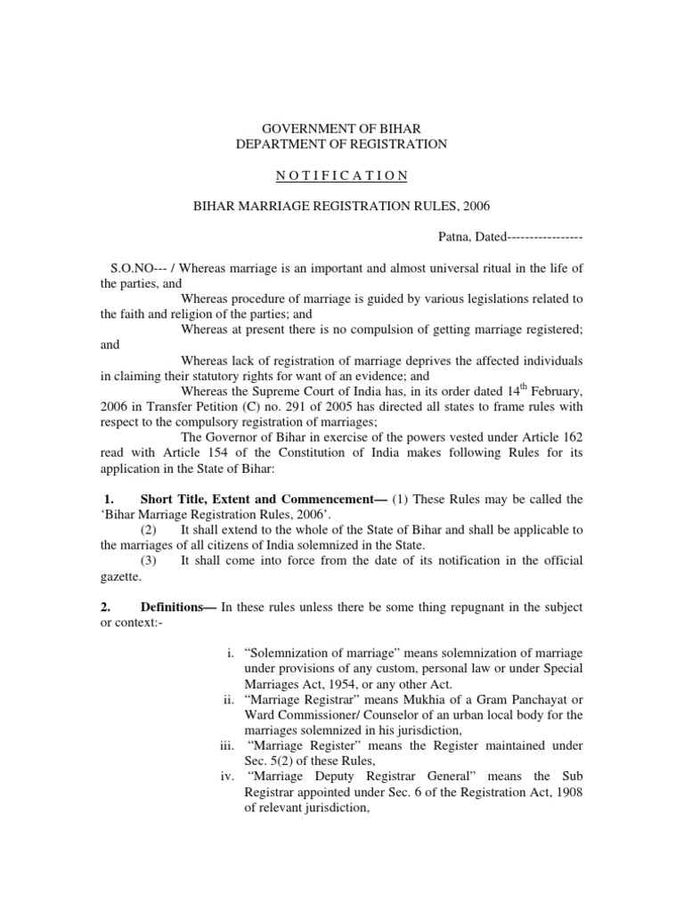 NO--- / Whereas marriage is an important and almost universal ritual in the life of the parties, and Whereas procedure of marriage is guided by various legislations related to the faith and religion of the parties; and Whereas at present there is no compulsion of getting marriage registered; and Whereas lack of registration of marriage deprives the affected individuals in claiming their statutory rights for want of an evidence; and Whereas the Supreme Court of India has, in its order dated 14th February, 2006 in Transfer Petition (C) no. 291 of 2005 has directed all states to frame rules with respect to the compulsory registration of marriages; The Governor of Bihar in exercise of the powers vested under Article 162 read with Article 154 of the Constitution of India makes following Rules for its application in the State of Bihar: 1. Short Title, Extent and Commencement (1) These Rules may be called the Bihar Marriage Registration Rules, 2006. (2) It shall extend to the whole of the State of Bihar and shall be applicable to the marriages of all citizens of India solemnized in the State. (3) It shall come into force from the date of its notification in the official gazette. 2. Definitions In these rules unless there be some thing repugnant in the subject or context:i. Solemnization of marriage means solemnization of marriage under provisions of any custom, personal law or under Special Marriages Act, 1954, or any other Act. ii. Marriage Registrar means Mukhia of a Gram Panchayat or Ward Commissioner/ Counselor of an urban local body for the marriages solemnized in his jurisdiction, iii. Marriage Register means the Register maintained under Sec. 5(2) of these Rules, iv. Marriage Deputy Registrar General means the Sub Registrar appointed under Sec. 6 of the Registration Act, 1908 of relevant jurisdiction,