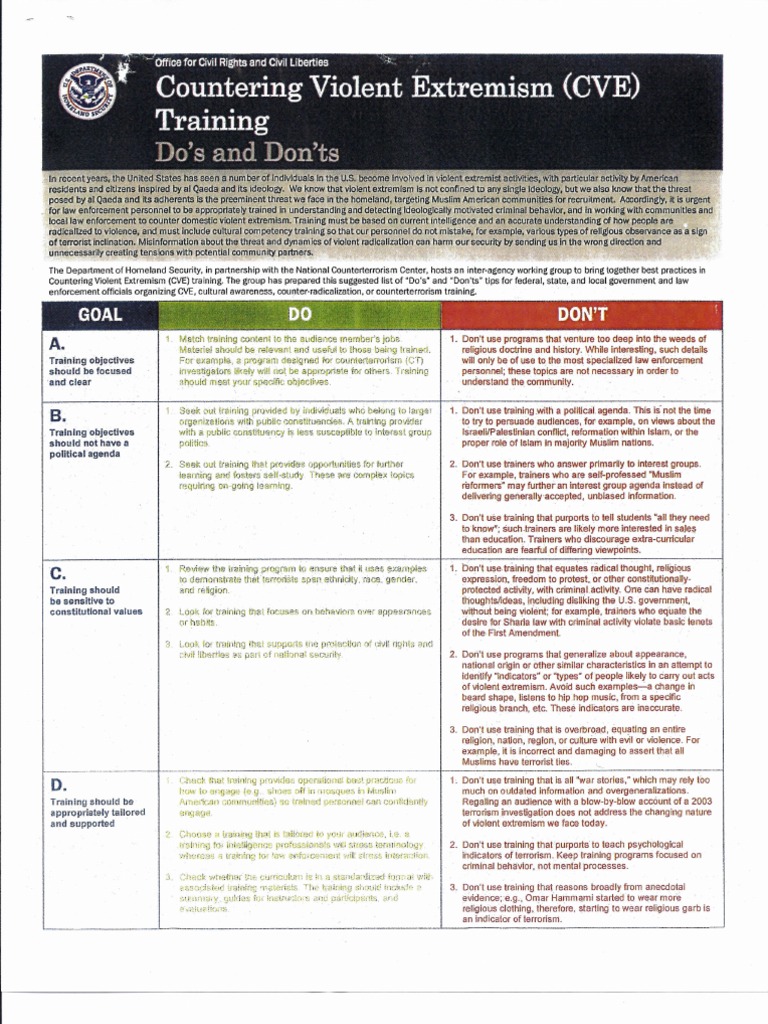CounteringViolentExtremism(CVE)training.Thegrouphaspreparedthissuggestedlistof Do's'and Don'ts tipsforfederal,state,andlocalgovernmentandlaw