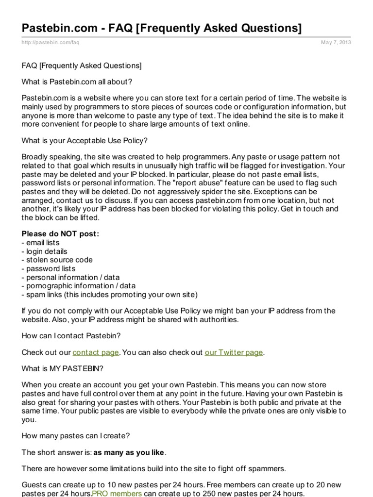 FAQ [Frequently Asked Questions] What is Pastebin.com all about? Pastebin.com is a website where you can store text for a certain period of time. The website is mainly used by programmers to store pieces of sources code or configuration information, but anyone is more than welcome to paste any type of text. The idea behind the site is to make it more convenient for people to share large amounts of text online. What is your Acceptable Use Policy? Broadly speaking, the site was created to help programmers. Any paste or usage pattern not related to that goal which results in unusually high traffic will be flagged for investigation. Your paste may be deleted and your IP blocked. In particular, please do not paste email lists, password lists or personal information. The "report abuse" feature can be used to flag such pastes and they will be deleted. Do not aggressively spider the site. Exceptions can be arranged, contact us to discuss. If you can access pastebin.com from one location, but not another, it's likely your IP address has been blocked for violating this policy. Get in touch and the block can be lifted. Please do NOT post : - email lists - login details - stolen source code - password lists - personal information / data - pornographic information / data - spam links (this includes promoting your own site) If you do not comply with our Acceptable Use Policy we might ban your IP address from the website. Also, your IP address might be shared with authorities. How can I contact Pastebin? Check out our contact page. You can also check out our Twitter page. What is MY PASTEBIN? When you create an account you get your own Pastebin. This means you can now store pastes and have full control over them at any point in the future. Having your own Pastebin is also great for sharing your pastes with others. Your Pastebin is both public and private at the same time. Your public pastes are visible to everybody while the private ones are only visible to you. How many pastes can I create? The short answer is: as many as you like . There are however some limitations build into the site to fight off spammers. Guests can create up to 10 new pastes per 24 hours. Free members can create up to 20 new pastes per 24 hours.PRO members can create up to 250 new pastes per 24 hours.