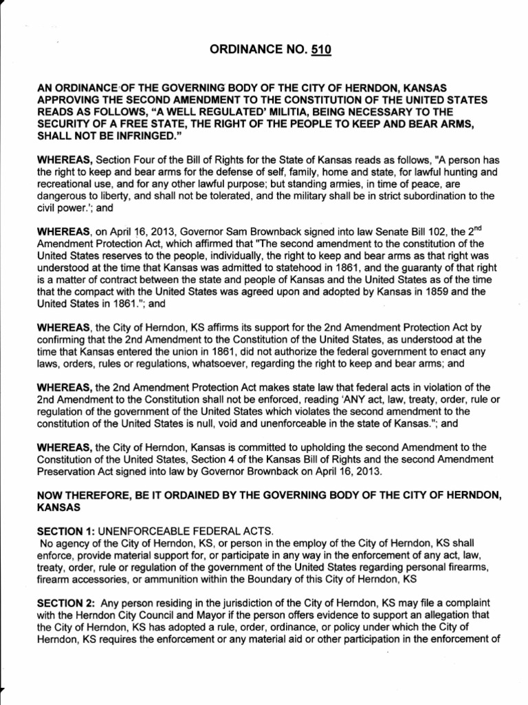 "No agency of the City of Herndon, KS, or person in the employ of the City of Herndon, KS shall enforce, provide material support for, or participate in any way in the enforcement of any act, law, treaty, order, rule or regulation of the government of the United States regarding personal firearms, firearm accessories, or ammunition within the Boundary of this City of Herndon, KS"