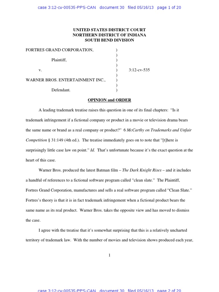 – and it includesa handful of references to a fictional software program called “clean slate.” The Plaintiff,Fortres Grand Corporation, manufactures and sells a real software program called “Clean Slate.” Fortres’s theory is that it is in fact trademark infringement when a fictional product bears thesame name as its real product. Warner Bros. takes the opposite view and has moved to dismissthe case.I agree with the treatise that it’s somewhat surprising that this is a relatively uncharted territory of trademark law. With the number of movies and television shows produced each year,1