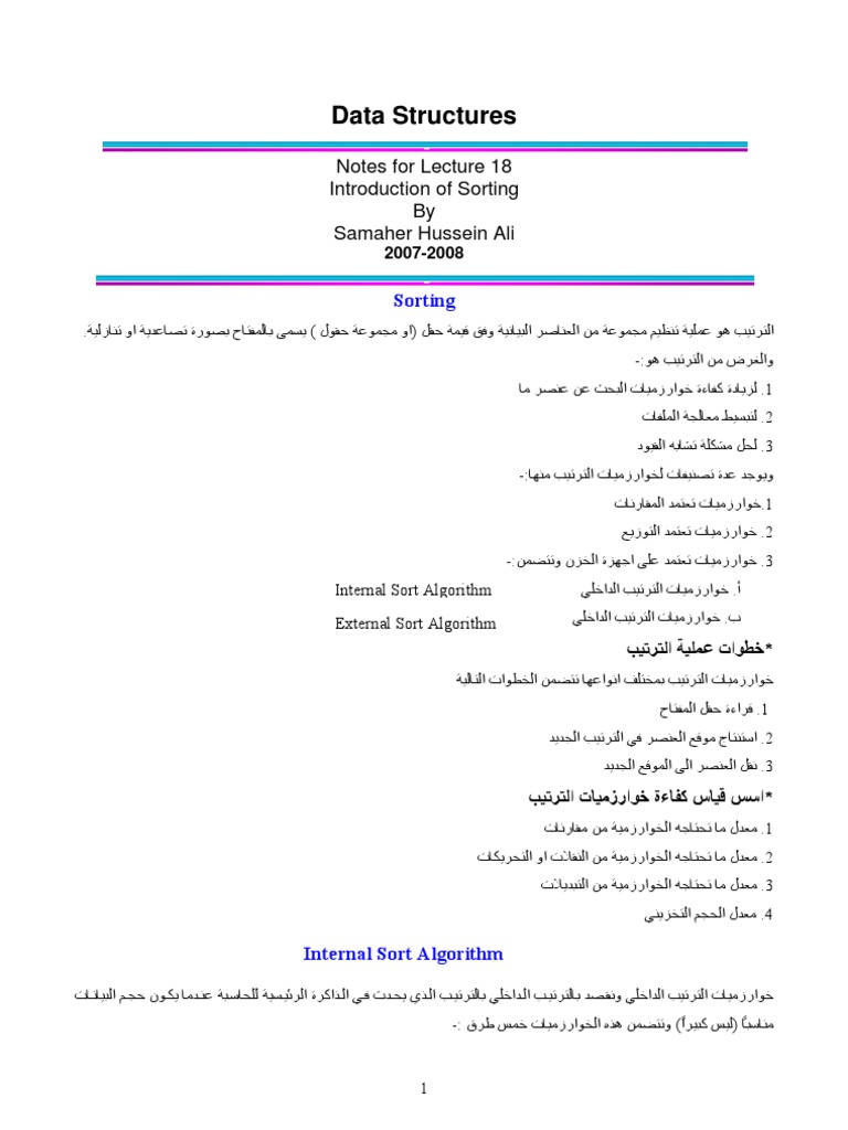 Internal Sort Algorithm أ .ﺧﻮارزﻣﻴﺎت اﻟﺘﺮﺗﻴﺐ اﻟﺪاﺧﻠﻲ