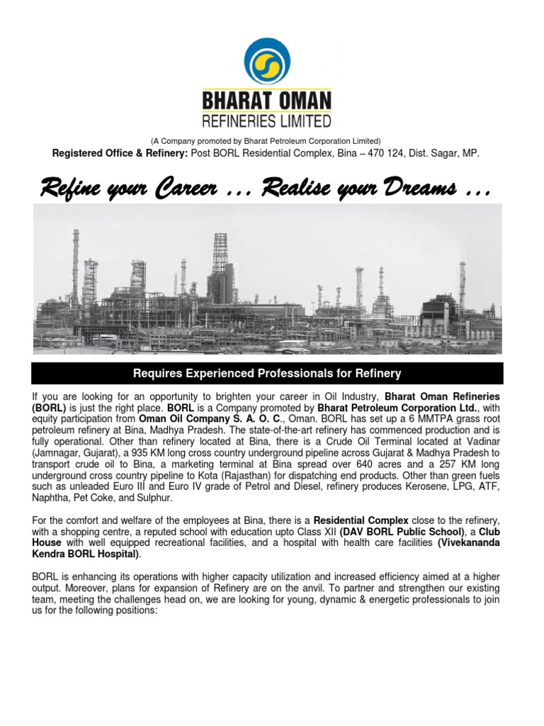 If you are looking for an opportunity to brighten your career in Oil Industry, Bharat Oman Refineries (BORL) is just the right place. BORL is a Company promoted by Bharat Petroleum Corporation Ltd., with equity participation from Oman Oil Company S. A. O. C., Oman. BORL has set up a 6 MMTPA grass root petroleum refinery at Bina, Madhya Pradesh. The state-of-the-art refinery has commenced production and is fully operational. Other than refinery located at Bina, there is a Crude Oil Terminal located at Vadinar (Jamnagar, Gujarat), a 935 KM long cross country underground pipeline across Gujarat & Madhya Pradesh to transport crude oil to Bina, a marketing terminal at Bina spread over 640 acres and a 257 KM long underground cross country pipeline to Kota (Rajasthan) for dispatching end products. Other than green fuels such as unleaded Euro III and Euro IV grade of Petrol and Diesel, refinery produces Kerosene, LPG, ATF, Naphtha, Pet Coke, and Sulphur. For the comfort and welfare of the employees at Bina, there is a Residential Complex close to the refinery, with a shopping centre, a reputed school with education upto Class XII (DAV BORL Public School), a Club House with well equipped recreational facilities, and a hospital with health care facilities (Vivekananda Kendra BORL Hospital). BORL is enhancing its operations with higher capacity utilization and increased efficiency aimed at a higher output. Moreover, plans for expansion of Refinery are on the anvil. To partner and strengthen our existing team, meeting the challenges head on, we are looking for young, dynamic & energetic professionals to join us for the following positions: