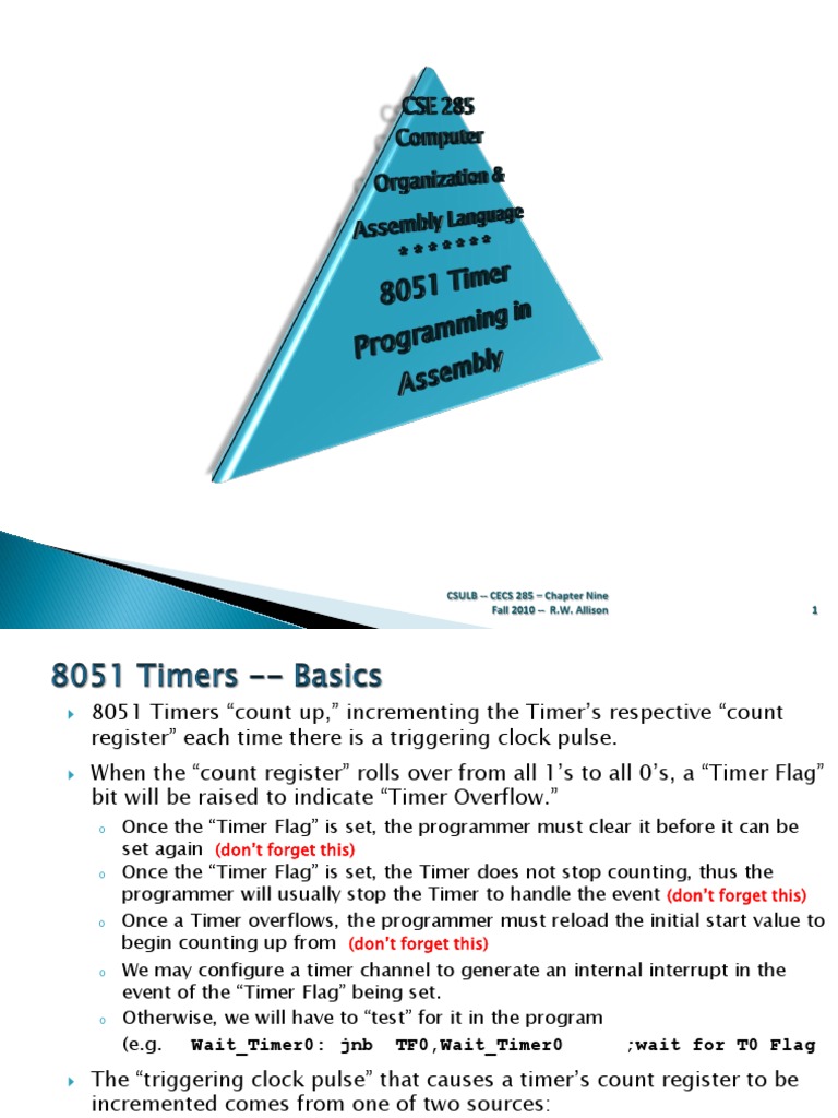 Once the Timer Flag is set, the programmer must clear it before it can be set again (dont forget this) Once the Timer Flag is set, the Timer does not stop counting, thus the programmer will usually stop the Timer to handle the event (dont forget this) Once a Timer overflows, the programmer must reload the initial start value to begin counting up from (dont forget this) We may configure a timer channel to generate an internal interrupt in the event of the Timer Flag being set. Otherwise, we will have to test for it in the program (e.g. Wait_Timer0: jnb TF0,Wait_Timer0 ;wait for T0 Flag