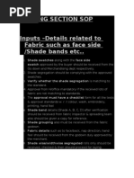 1) Shade swatches along with the face side swatch approved by the buyer should be received from the Go down and Merchandising dept respectively. 2) Shade segregation should be complying with the approved swatches. 3) Verify whether the shade segregation is matching to the standard. 4) Approval from H/office mandatory if the received lots of fabric are not matching to standards. 5) The approval must have a checklist form for all the tests & approval standards w. r. t colour, wash, embroidery, printing, hand feel 6) Shade band details (Shade A, B, C, D) after verification should be received from fabric inspector & spreading team also should be given a copy for reference. 7) Shade grouping also must be received from the fabric godown. 8) Fabric details such as to face/back, nap direction; hand feel should be received from the godown duly approved by the merchant. 9) Shade wise/widthwise segregated rolls only should be received, checked & then should proceed for laying. 10) Both ends of every roll should have sticker consisting details of shade no, roll no, width and other relevant detail to enable easy identification of rolls.