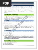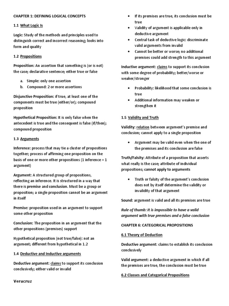 1 What Logic Is Logic: Study of the methods and principles used to distinguish correct and incorrect reasoning; looks into form and quality 1.2 Propositions Proposition: An assertion that something is (or is not) the case; declarative sentence; either true or false a. Simple: only one assertion b. Compound: 2 or more assertions Disjunctive Proposition: if true, at least one of the components must be true (either/or); compound proposition Hypothetical Proposition: It is only false when the antecedent is true and the consequent is false (if/then); compound proposition 1.3 Arguments Inference: process that may tie a cluster of propositions together; process of affirming one proposition on the basis of one or more other propositions (1 inference = 1 argument) Argument: A structured group of propositions, reflecting an inference. It is structured in a way that there is premise and conclusion. Must be a group or proposition; a single proposition cannot be an argument in itself Premise: proposition used in an argument to support some other proposition Conclusion: The proposition in an argument that the other propositions (premises) support Hypothetical proposition (not true/false): not an argument; different from hypothetical in 1.2 1.4 Deductive and Inductive arguments Deductive argument: claims to support its conclusion conclusively; either valid or invalid