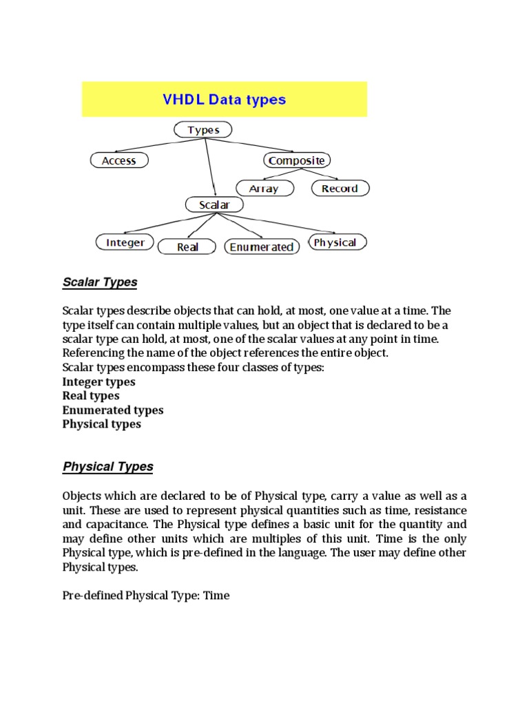 Objects which are declared to be of Physical type, carry a value as well as a unit. These are used to represent physical quantities such as time, resistance and capacitance. The Physical type defines a basic unit for the quantity and may define other units which are multiples of this unit. Time is the only Physical type, which is pre-defined in the language. The user may define other Physical types. Pre-defined Physical Type: Time
