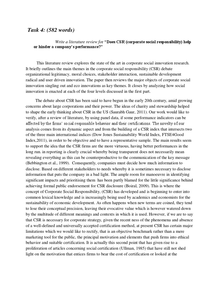 Write a literature review for Does CSR (corporate social responsibility) help or hinder a companys performance?