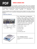 DIRECT SHEAR TEST A direct shear test is a laboratory test used by geotechnical engineers to find the shear strength parameters of soil. In the U.S., the standard defining how the test should be performed is ASTM D 3080. The test is performed on three or four specimens from a relatively undisturbed soil sample. A specimen is placed in a shear box which has two stacked rings to hold the sample; the contact between the two rings is at approximately the mid-height of the sample. A confining stress is applied vertically to the specimen, and the upper ring is pulled laterally until the sample fails, or through a specified strain. The load applied and the strain induced is recorded at frequent intervals to determine a stress-strain curve for the confining stress. Direct Shear tests can be performed under several conditions. The sample is normally saturated before the test is run, but can be run at the in-situ moisture content. The rate of strain can be varied to create a test of undrained or drained conditions, depending whether the strain is applied slowly enough for water in the sample to prevent pore-water pressure buildup.