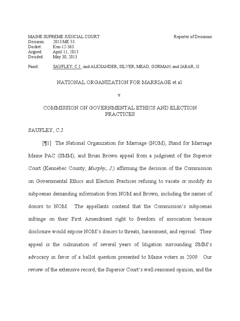 SAUFLEY, C.J. [¶1] The National Organization for Marriage (NOM), Stand for Marriage Maine PAC (SMM), and Brian Brown appeal from a judgment of the Superior Court (Kennebec County,