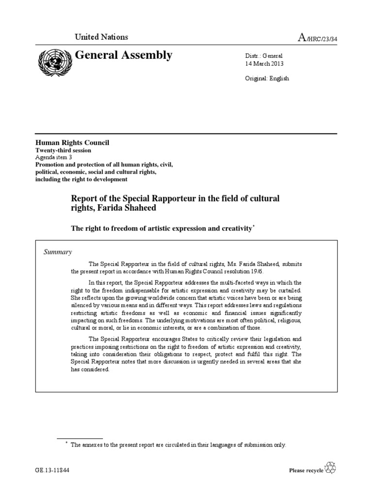 1. The present report focuses on the right to the freedom indispensable for artistic expression and creativity, protected under articles 15 of the International Covenant on Economic, Social and Cultural Rights (ICESCR) and 19 of the International Covenant on Civil and Political Rights (ICCPR). 2. Art constitutes an important vehicle for each person, individually and in community with others, as well as groups of people, to develop and express their humanity, worldview and meanings assigned to their existence and development. People in all societies create, make use of, or relate to, artistic expressions and creations. 3. Artists may entertain people, but they also contribute to social debates, sometimes bringing counter-discourses and potential counterweights to existing power centres. The vitality of artistic creativity is necessary for the development of vibrant cultures and the functioning of democratic societies. Artistic expressions and creations are an integral part of cultural life, which entails contesting meanings and revisiting culturally inherited ideas and concepts. The crucial task of implementation of universal human rights norms is to prevent the arbitrary privileging of certain perspectives on account of their traditional authority, institutional or economic power, or demographic supremacy in society. This principle lies at the heart of every issue raised in the debate over the right to freedom of artistic expression and creativity and possible limitations on that right. 4. There is no intention to propose a definition of art, or to suggest that additional rights should be recognized for artists. All persons enjoy the rights to freedom of expression and creativity, to participate in cultural life and to enjoy the arts. Expressions, whether artistic or not, always remain protected under the right to freedom of expression. 5. This report aims to understand the challenges and obstacles that impede the flourishing of artistic creativity, and make specific recommendations to overcome them. The approach adopted is broad. The report addresses forms of expression that carry an aesthetic and/or symbolic dimension, using different media including, but not limited to, painting and drawing, music, songs and dances, poetry and literature, theatre and circus, photography, cinema and video, architecture and sculpture, performances and public art interventions, etc., irrespective of whether their content is sacred or profane, political or apolitical, or whether it addresses social issues or not. It recognizes that artistic activity relies on a large number of actors not reducible to the artist per se, encompassing all those engaged in and contributing to the creation, production, distribution and dissemination of artistic expressions and creations. The Special Rapporteur is convinced that freedom of artistic expression and creativity cannot be dissociated from the right of all persons to enjoy the arts, as in many cases restrictions on artistic freedoms aim at denying people access to specific artworks. Hence, removing creative expressions from public access is a way to restrict artistic freedom. Ironically enough, restrictions are often imposed in the name of the public which, however, is prevented from making its own judgement. 6. Artistic expressions and creations come under particular attack because they can convey specific messages and articulate symbolic values in a powerful way, or may be considered as doing so. Motivations for restrictions stem from political, religious, cultural, moral or economic interests, and disturbing cases of violations are found on all continents. 1