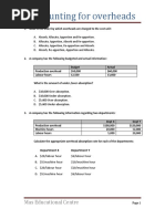 ~ Overheads incurred for a period of time. It is time related (period costs). the actual overheads incurred will only be known or determined at the end of the period. ~ However, evaluation of cost units (calculation of cost/ unit) is an on-going process throughout the period. predetermined overhead absorption rates are required in advance of the period using estimated or budgeted figures for overhead and for the number of units of the absorption base. ~ During the period: Cost per unit: Direct materials cost Direct labour cost Direct expenses Prime cost Production overhead absorbed Cost per unit (for stock valuation & cost of sales calculation) As a result of the absorption, some adjustments are required in the year end profit statement: Period: START Budgeted overheads Budgeted base OAR Period: DURING OAR x Actual base Overheads absorbed Period: END Total overheads absorbed ~ Total actual overheads incurred Over/ under absorption of overheads X X X X X X