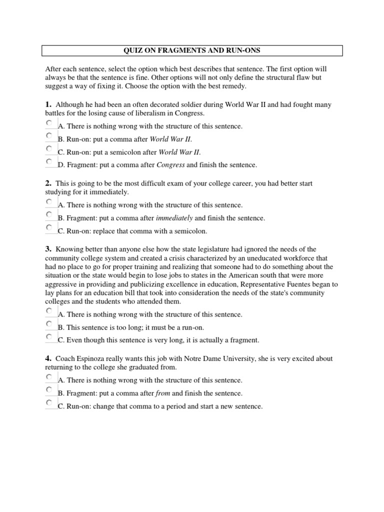 QUIZ ON FRAGMENTS AND RUN-ONS After each sentence, select the option which best describes that sentence.