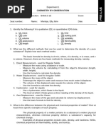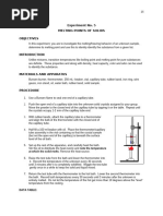 4. Allow solid to completely melt. Record the final temperature. E. Boiling Point (for Liquid Unknown) 1. Add 3mL of liquid unknown to a clean, dry test tube. 2. Fit the test tube with a rubber stopper that has one slit 3. Insert the thermometer into the slit and position it so that it barely touches the liquid unknown 4. Clamp the test tube to the ring stand 5. Half fill a 250mL beaker with water 6. Position the beaker over a Bunsen burner 7. Position the test tube so that it sits in the water 8. Heat the water gradually and watch for changes in temperature. 9. The temperature will be constant at the boiling point of the liquid unknown. 10. Record the observed boiling point and correct it to the true boiling point at room atmospheric pressure. F. Unknown Identification 1. Using Table 2.1, compare observed properties of the solid and liquid unknown with those in the table. 2. Identify both unknowns and record the results. PROCEDURE MODIFICATION The procedure was changed as depicted below: a. Used 125 mL Erlenmeyer flask instead of 50 mL Erlenmeyer flask. OBSERVATION A. a. Napthalene was insoluble in water, forming a precipitate. Soluble in cyclohexane, and sparingly soluble in ethanol. b. Toluene was insoluble in water, soluble in cyclohexane, and sparingly soluble in ethanol. c. Liquid unknown was soluble in water, insoluble in cyclohexane, and soluble in ethanol. d. Solid unknown was insoluble in water, soluble in cyclohexane, and soluble in ethanol. B. a. Weighed solid to 1.48g b. Use pipet to draw 6.00 mL