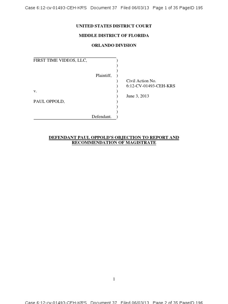 Defendant, Paul Oppold, files this objection to report and recommendation of the magistrate and states, in support thereof, upon review de novo 28 U.S.C. 636(b)(1); Camby v. Davis, 718 F.2d 198, 200 (4th Cir.1983), that: I. FACTS OMIT CLEAR PRENDA LAW INVOLVEMENT Defendant makes no objection to the procedural history of this case as reported, except as to the statement that on July 30th, 2012, First Time Videos, "through its attorney, George A. Banas, Esq., filed a complaint against Defendant." Such a finding is an oversimplification of fact, smears the name of Mr. Banas, and neglects the involvement and activities of the now infamous Prenda Law in this case, as managers of the litigation. A. Facts Omit Prenda Law Involvement Plaintiff First Time Videos and filing attorney George A. Banas, Esq. filed this case at the direction an outfit named Prenda Law that has continued managing this case despite the attempted withdrawal of two attorneys and the attempted withdraw of their current counsel. See Doc. 7, Doc, 21, Doc. 27. 1 See also Exhibit "A" (e-mail of George Banas- admitting Prenda Law directed him to file the case.) Further, despite claims to the contrary at various documents in the record, Plaintiff has admitted an objective opinion that this matter is motivated by a dispute, specifically a "feud" between Prenda Law and Defendant's counsel. See Exhibit "B" (stating "The only thing I can say is that I'm glad I
