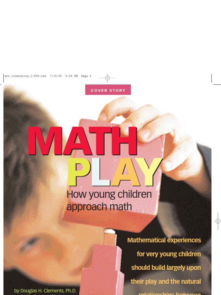 dow, Katie moved it to the center of the living room, saying, The couch should be in front of the TV. The range of mathematics explored during free play is impressive. We can see that free play offers a rich foundation on which to build interesting mathematics. These everyday experiences form the foundation for later mathematics. Later, children elaborate on these ideas. We call this process mathematization. And we recognize that children need both these foundational experiences, as well as specific math activities. Play does not guarantee mathematical development, but it offers rich possibilities. Significant benefits are more likely when teachers follow up by engaging children in reflecting on and representing the mathematical ideas that have emerged in their play. Teachers enhance childrens mathematics learning when they ask questions that provoke clarifications, extensions, and development of new understandings.