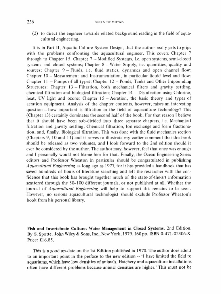Fish and Invertebrate Culture: Water Management in Closed Systems. 2nd Edition. By S. Spotte. John Wiley & Sons, Inc., New York, 1979.160 pp. ISBN 0-471-02306-X. Price: 16.85.