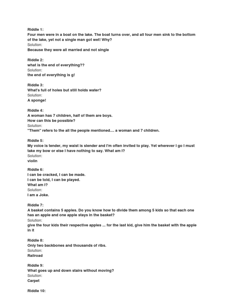 The boat turns over, and all four men sink to the bottom of the lake, yet not a single man got wet! Why? Solution: Because they were all married and not single Riddle 2: what is the end of everything?? Solution: the end of everything is g! Riddle 3: What's full of holes but still holds water? Solution: A sponge! Riddle 4: A woman has 7 children, half of them are boys. How can this be possible? Solution: "Them" refers to the all the people mentioned.... a woman and 7 children. Riddle 5: My voice is tender, my waist is slender and I'm often invited to play. Yet wherever I go I must take my bow or else I have nothing to say. What am I? Solution: violin Riddle 6: I can be cracked, I can be made. I can be told, I can be played. What am I? Solution: I am a Joke. Riddle 7: A basket contains 5 apples. Do you know how to divide them among 5 kids so that each one has an apple and one apple stays in the basket? Solution: give the four kids their respective apples ... for the last kid, give him the basket with the apple in it Riddle 8: Only two backbones and thousands of ribs. Solution: Railroad Riddle 9: What goes up and down stairs without moving? Solution: Carpet Riddle 10: