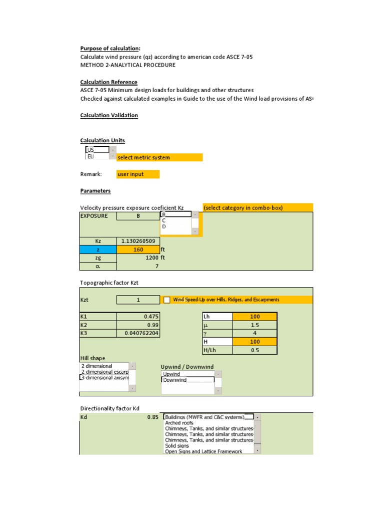 Purpose of calculation: Calculate wind pressure (qz) according to american code ASCE 7-05 METHOD 2-ANALYTICAL PROCEDURE