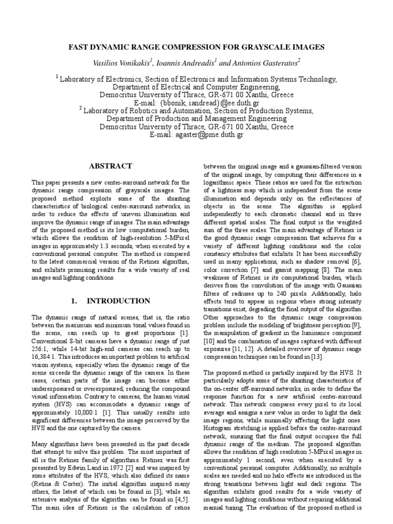 This subsection presents the results of the comparison between the MSR and the proposed algorithm, in a set of real high-resolution grayscale images. Most of the imagesrepresent scenes that were captured with different digitalcameras under different lighting conditions where dynamicrange correction is required. Table 1 exhibits some of theresults that were obtained by the proposed method andMSR. For every image, its size and the execution times of the two methods are included. It is important to mentionthat the PhotoFlair software that was used to obtain theMSR outputs has 3 different versions of the Retinexalgorithm: Scenic Retinex, Portrait Retinex and PortraitRetinex followed by ‘auto levels’, which is a form of