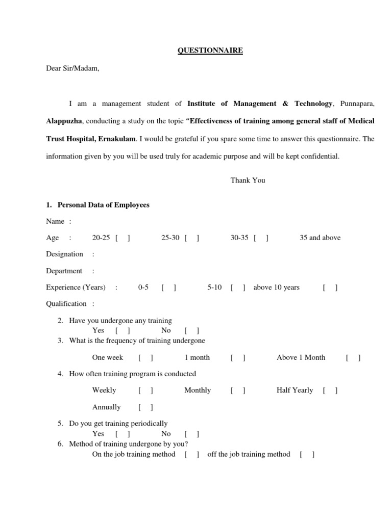 I am a management student of Institute of Management & Technology, Punnapara, Alappuzha, conducting a study on the topic Effectiveness of training among general staff of Medical Trust Hospital, Ernakulam. I would be grateful if you spare some time to answer this questionnaire. The information given by you will be used truly for academic purpose and will be kept confidential. Thank You 1. Personal Data of Employees Name : Age : 20-25 [ : : : 0-5 [ ] 5-10 [ ] above 10 years [ ] ] 25-30 [ ] 30-35 [ ] 35 and above