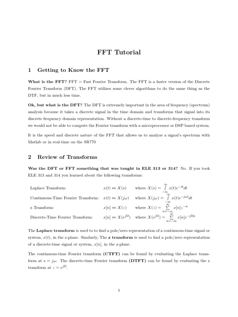 What is the FFT? FFT = Fast Fourier Transform. The FFT is a faster version of the Discrete Fourier Transform (DFT). The FFT utilizes some clever algorithms to do the same thing as the DTF, but in much less time. Ok, but what is the DFT? The DFT is extremely important in the area of frequency (spectrum) analysis because it takes a discrete signal in the time domain and transforms that signal into its discrete frequency domain representation. Without a discrete-time to discrete-frequency transform we would not be able to compute the Fourier transform with a microprocessor or DSP based system. It is the speed and discrete nature of the FFT that allows us to analyze a signals spectrum with Matlab or in real-time on the SR770