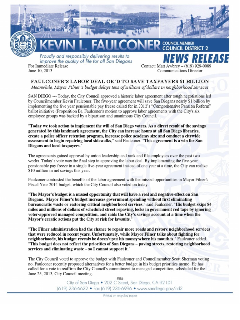 SAN DIEGO --- Today, the City Council approved a historic labor agreement after tough negotiations led by Councilmember Kevin Faulconer. The five-year agreement will save San Diegans nearly $1 billion by implementing the five year pensionable pay freeze called for in 2012s Comprehensive Pension Reform ballot initiative (Proposition B). Faulconer's motion to approve labor agreements with the City's six employee groups was backed by a bipartisan and unanimous City Council. "Today we took action to implement the will of San Diego voters. As a direct result of the savings generated by this landmark agreement, the City can increase hours at all San Diego libraries, create a police officer retention program, increase police academy size and conduct a citywide assessment to begin repairing local sidewalks," said Faulconer. "This agreement is a win for San Diegans and local taxpayers." The agreements gained approval by union leadership and rank and file employees over the past two weeks. Todays vote was the final step in approving the labor deal. By implementing the five-year pensionable pay freeze in a single five-year agreement instead of one year at a time, the City can realize $10 million in net savings this year. Faulconer contrasted the benefits of the labor agreement with the missed opportunities in Mayor Filner's Fiscal Year 2014 budget, which the City Council also voted on today. "The Mayors budget is a missed opportunity that will have a real and negative effect on San Diegans. Mayor Filner's budget increases government spending without first eliminating bureaucratic waste or restoring critical neighborhood services," said Faulconer. "His budget skips 84 miles and millions of dollars of scheduled street repaving, locks in government red tape by ignoring voter-approved managed competition, and raids the City's savings account at a time when the Mayor's erratic actions put the City at risk for lawsuits." "The Filner administration had the chance to repair more roads and restore neighborhood services that were reduced in recent years. Unfortunately, while Mayor Filner talks about fighting for neighborhoods, his budget reveals he doesnt put his money where his mouth is," Faulconer added. "This budget does not reflect the priorities of San Diegans paving streets, restoring neighborhood services and eliminating waste so I cannot support it." The City Council voted to approve the budget with Faulconer and Councilmember Scott Sherman voting no. Faulconer recently proposed alternatives for a better budget in his budget priorities memo. He has called for a vote to reaffirm the City Council's commitment to managed competition, scheduled for the June 25, 2013, City Council meeting. ###