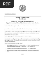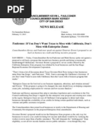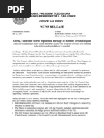 Operations, Public Utilities Customer Care Center, and Storm Water Operations. These operations could save the City millions of dollars. Solid Waste has an annual operating budget of approximately $30 million. Using the average managed competition savings, the taxpayers could save $5.58 million annually on that competition alone. This important money-saving tool must not be ignored any longer. Accountable Budget Practices The utilization of one-time resources for ongoing expenditures is financially irresponsible and is contrary to the Guiding Principles for Structural Elimination Plan, which was approved by Council on February 22, 2010. This years budget is largely balanced by removing $12.9 million from the Public Liability Reserve Fund. This is concerning since sufficient funds are not available for use in the subsequent fiscal year. A financial plan that relies on future projected growth to solve a deficit is not fiscally sound. According to the IBA Report Number 12-37, the Government Finance Officers Associations (GFOA) best practice recommends two months of City expenditures or approximately 16.7% of General Fund appropriations. To ensure that the Citys bond rating remains stable and the City is appropriately prepared for future economic uncertainty, I support updating the reserve policy to a minimum of 15%. An adjustment in this policy from 8% to 15% would mitigate future risk of service reductions during economic downturns. Putting Neighborhoods First I am proud to have fought to keep libraries and recreation centers open in the face of severe budget deficits. In the Mayors budget there are significant budgetary increases from Fiscal Year 2013, but these increases do nothing to restore key neighborhood restorations such as increased library hours, parks and recreation services and, in fact, puts at risk vital neighborhood programs such as the Neighborhood Prosecution Unit in the City Attorneys Office. I will continue to put neighborhoods first and focus on these top priorities. Libraries Branch library hours are currently at 44 hours per week, 4 hours less than the average 48 hours per week in 2001. The Mayors budget increases expenditures significantly without any restorations to branch libraries. Branch libraries contribute significantly to the community fabric of our local neighborhoods by providing space for civic engagements, engaging local youth in educational activities, and providing technological resources and job development training for San Diegans looking for employment. I will continue to be an advocate for these vital community assets.