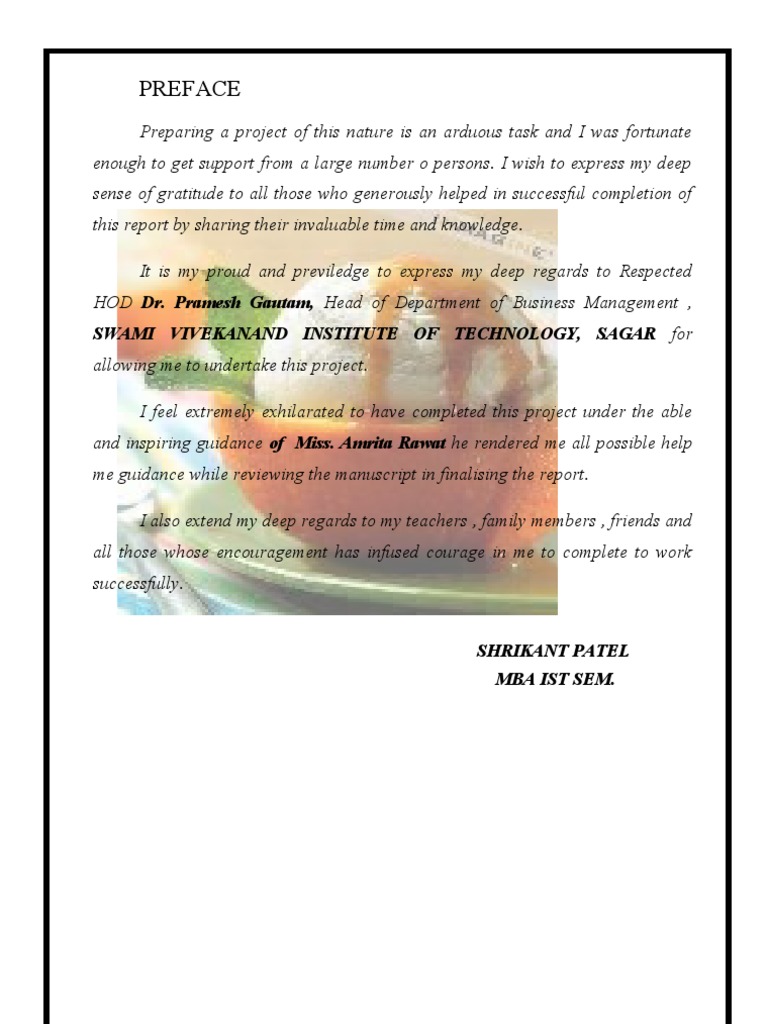 Preparing a project of this nature is an arduous task and I was fortunate enough to get support from a large number o persons. I wish to express my deep sense of gratitude to all those who generously helped in successful completion of this report by sharing their invaluable time and knowledge. It is my proud and previledge to express my deep regards to Respected HOD Dr. Pramesh Gautam, Head of Department of Business Management , SWAMI VIVEKANAND INSTITUTE OF TECHNOLOGY, SAGAR for allowing me to undertake this project. I feel extremely exhilarated to have completed this project under the able and inspiring guidance of Miss. Amrita Rawat he rendered me all possible help me guidance while reviewing the manuscript in finalising the report. I also extend my deep regards to my teachers , family members , friends and all those whose encouragement has infused courage in me to complete to work successfully.