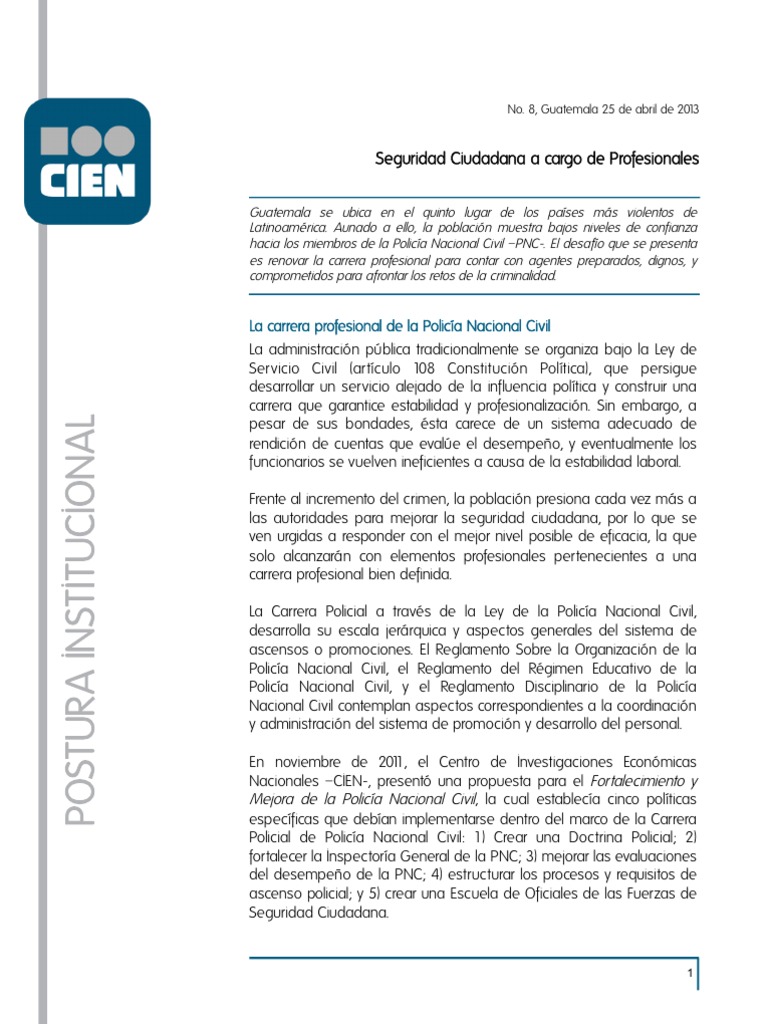 , la cual establecía cinco políticas específicas que debían implementarse dentro del marco de la Carrera Policial de Policía Nacional Civil: 1) Crear una Doctrina Policial; 2) fortalecer la Inspectoría General de la PNC; 3) mejorar las evaluaciones del desempeño de la PNC; 4) estructurar los procesos y requisitos de ascenso policial; y 5) crear una Escuela de Oficiales de las Fuerzas de Seguridad Ciudadana. ı