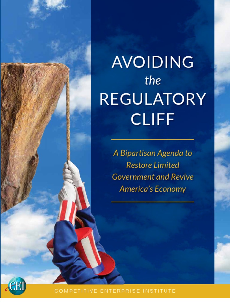 what is visible and immediate. This can create conflicts between the economically sensible and the politically fashionable. Consequently, I am pleased to present Avoiding the Regulatory Cliff: A Bipartisan Agenda to Restore Limited Government and Revive Americas Economy. In this document, CEI policy experts have created concrete, achievable proposals to liberate the creative energies of American entrepreneurs, companies, and workers. Our compendium highlights four important lessons. The first is that markets are dynamic. Contrary to textbook models, real-world markets are not static, predictable, or perfectly efficientlike machines. Rather, they are dynamic, unpredictable, and self-organizinglike organisms. The second lesson is that markets encourage experimentation, and through trial-and-error, innovations produce progress. Markets lead to economic progress because they encourage and test on-the-spot experimentation among millions of individuals. From this decentralized trial-and-error process come innovations and coordination that no single mind could have planned. The third lesson is when altering rules of the game, be aware of unseen consequences. The institutions governing markets are crucial. Given that markets are so complex and ever changing, and given that people respond to incentives created by institutions, minor changes