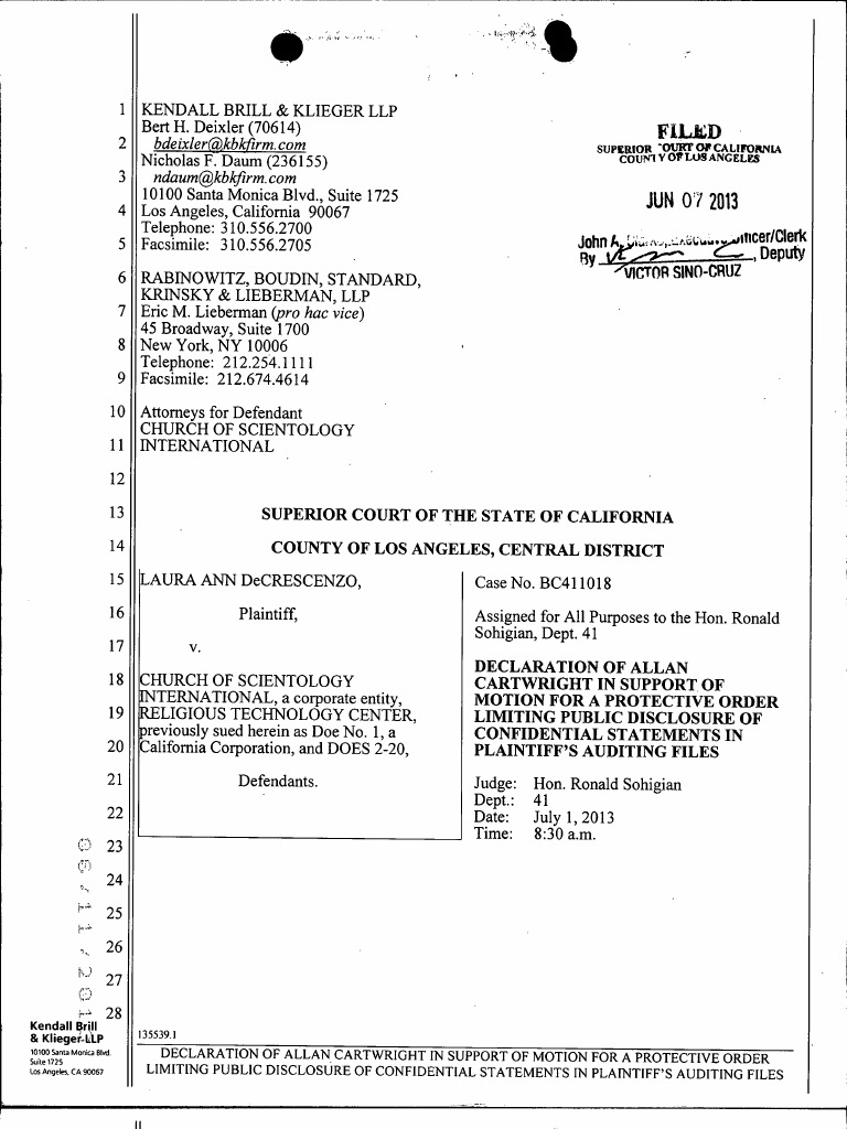 In support of Scientology's motion for protective custody in the DeCrescenzo lawsuit