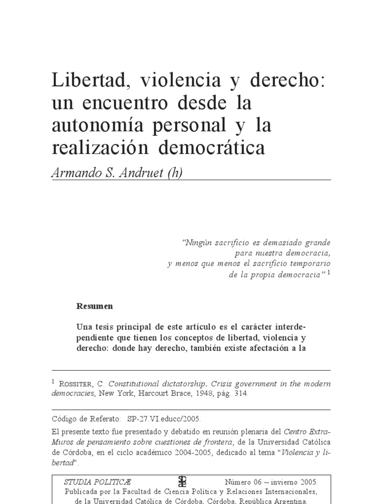 Resumen Una tesis principal de este artículo es el carácter interdependiente que tienen los conceptos de libertad, violencia y derecho: donde hay derecho, también existe afectación a la