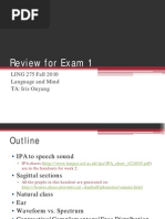 resonant (as in keep, car, corn, creep), while syllable-nal [k] is a lot less variable in its place of articulation. Phonetic details like these provide listeners with a lot of information about linguistic structure: and this is information that they can use to make sense out of the sounds of speech. Secondly, we have seen that there are many things we can observe phonetically that relate to meaning, but not to word meaning. For example, the use of voice quality to convey a stance towards the thing being talked about; the use of in-breaths and clicks to project I have more to say; the clustering of ejective sounds with other phonetic details around pauses of particular types: all these things seem to be used by speakers to mark something that goes beyond word meaning. Another kind of non-lexical meaning involves the use of one sound in place of another that is found in more standard varieties. Examples of this include the use of glottal stops in the place of [t] or [d], or the more open articulations found in Liverpool, or the particular voice quality found in Glasgow. These details index another kind of meaning: I am from (where I am from), or I belong to such-and-such a social group. Phonetic details at all levels are not extras, but are often an indispensable part of speakers phonetic repertoires. Some of the most exciting work in phonetics at the moment comes from the systematic exploration of how such details work in everyday talk, taking into account speakers sociolinguistic background, marking stance, attitude and affect, and looking at how talk is organised in conversation. There is still a great deal that we do not know, for example, about the way speakers use intonation, voice quality, sounds made with non-pulmonic airstreams, and other phonetic parameters to generate meaning. In our studies, we have used our eyes (through the use of symbols, spectrograms, waveforms and other diagrams), our ears (listening and reecting on our own productions), and our awareness of our own vocal tracts (reecting how it feels to make a sound), as well as data from carefully controlled recordings and everyday conversation. Phonetics is, by its very nature, a multisensory discipline. Human communication is also a multisensory phenomenon: whether our language is spoken or signed, language is ultimately produced, sensed and mediated through our bodies. One growing area for research in phonetics is how our speech is co-ordinated with other physical activities like body posture, pointing gestures, eye gaze and eyebrow movements; another is how the brain handles speech and language. What comes next for you, the reader? This will depend on your own interests, but a better understanding of acoustics will make it easier for you to appreciate how speech perception works. There is much more to