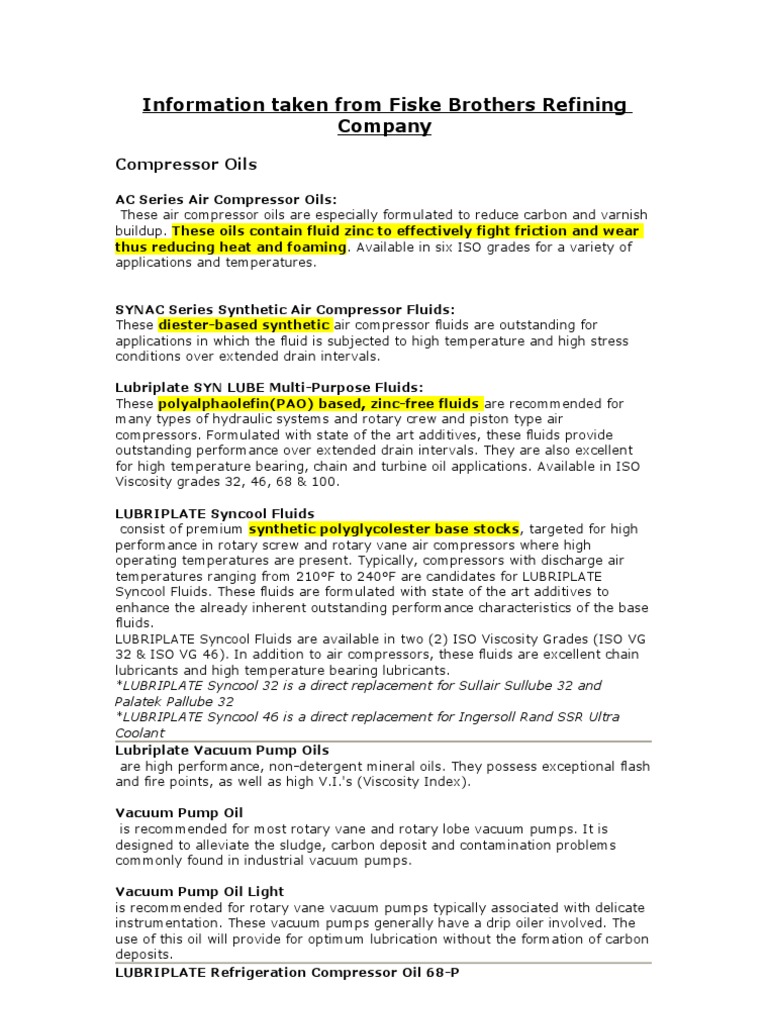 AC Series Air Compressor Oils: These air compressor oils are especially formulated to reduce carbon and varnish buildup. These oils contain fluid zinc to effectively fight friction and wear thus reducing heat and foaming. Available in six ISO grades for a variety of applications and temperatures. SYNAC Series Synthetic Air Compressor Fluids: These diester-based synthetic air compressor fluids are outstanding for applications in which the fluid is subjected to high temperature and high stress conditions over extended drain intervals. Lubriplate SYN LUBE Multi-Purpose Fluids: These polyalphaolefin(PAO) based, zinc-free fluids are recommended for many types of hydraulic systems and rotary crew and piston type air compressors. Formulated with state of the art additives, these fluids provide outstanding performance over extended drain intervals. They are also excellent for high temperature bearing, chain and turbine oil applications. Available in ISO Viscosity grades 32, 46, 68 & 100. LUBRIPLATE Syncool Fluids consist of premium synthetic polyglycolester base stocks, targeted for high performance in rotary screw and rotary vane air compressors where high operating temperatures are present. Typically, compressors with discharge air temperatures ranging from 210F to 240F are candidates for LUBRIPLATE Syncool Fluids. These fluids are formulated with state of the art additives to enhance the already inherent outstanding performance characteristics of the base fluids. LUBRIPLATE Syncool Fluids are available in two (2) ISO Viscosity Grades (ISO VG 32 & ISO VG 46). In addition to air compressors, these fluids are excellent chain lubricants and high temperature bearing lubricants. *LUBRIPLATE Syncool 32 is a direct replacement for Sullair Sullube 32 and Palatek Pallube 32 *LUBRIPLATE Syncool 46 is a direct replacement for Ingersoll Rand SSR Ultra Coolant Lubriplate Vacuum Pump Oils are high performance, non-detergent mineral oils. They possess exceptional flash and fire points, as well as high V.I.'s (Viscosity Index). Vacuum Pump Oil is recommended for most rotary vane and rotary lobe vacuum pumps. It is designed to alleviate the sludge, carbon deposit and contamination problems commonly found in industrial vacuum pumps. Vacuum Pump Oil Light is recommended for rotary vane vacuum pumps typically associated with delicate instrumentation. These vacuum pumps generally have a drip oiler involved. The use of this oil will provide for optimum lubrication without the formation of carbon deposits. LUBRIPLATE Refrigeration Compressor Oil 68-P