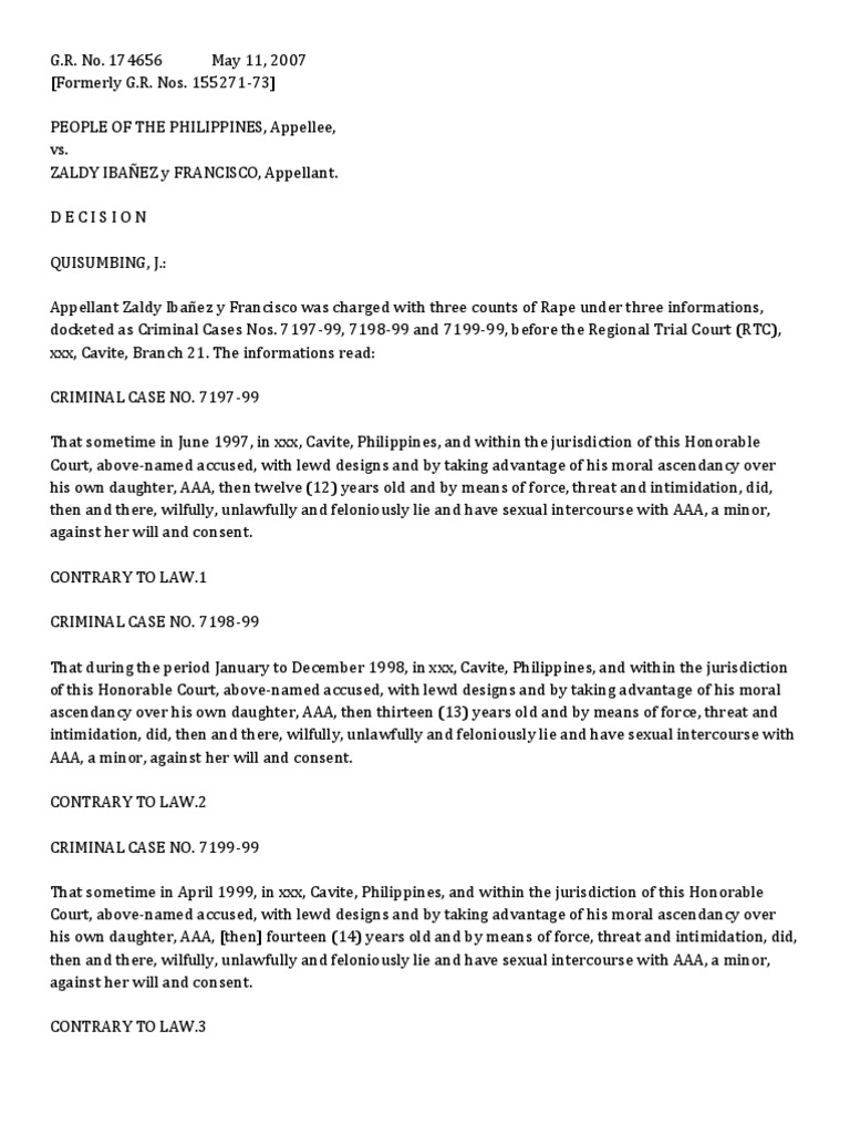 ZALDY IBAEZ y FRANCISCO, Appellant. DECISION QUISUMBING, J.: Appellant Zaldy Ibaez y Francisco was charged with three counts of Rape under three informations, docketed as Criminal Cases Nos. 7197-99, 7198-99 and 7199-99, before the Regional Trial Court (RTC), xxx, Cavite, Branch 21. The informations read: CRIMINAL CASE NO. 7197-99 That sometime in June 1997, in xxx, Cavite, Philippines, and within the jurisdiction of this Honorable Court, above-named accused, with lewd designs and by taking advantage of his moral ascendancy over his own daughter, AAA, then twelve (12) years old and by means of force, threat and intimidation, did, then and there, wilfully, unlawfully and feloniously lie and have sexual intercourse with AAA, a minor, against her will and consent. CONTRARY TO LAW.1 CRIMINAL CASE NO. 7198-99 That during the period January to December 1998, in xxx, Cavite, Philippines, and within the jurisdiction of this Honorable Court, above-named accused, with lewd designs and by taking advantage of his moral ascendancy over his own daughter, AAA, then thirteen (13) years old and by means of force, threat and intimidation, did, then and there, wilfully, unlawfully and feloniously lie and have sexual intercourse with AAA, a minor, against her will and consent. CONTRARY TO LAW.2 CRIMINAL CASE NO. 7199-99 That sometime in April 1999, in xxx, Cavite, Philippines, and within the jurisdiction of this Honorable Court, above-named accused, with lewd designs and by taking advantage of his moral ascendancy over his own daughter, AAA, [then] fourteen (14) years old and by means of force, threat and intimidation, did, then and there, wilfully, unlawfully and feloniously lie and have sexual intercourse with AAA, a minor, against her will and consent. CONTRARY TO LAW.3