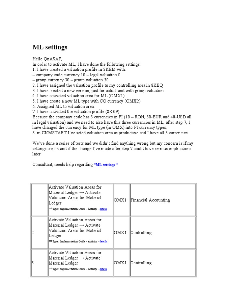 Hello QnASAP, In order to activate ML, I have done the following settings: 1. I have created a valuation profile in 8KEM with: company code currency 10 legal valuation 0 group currency 30 group valuation 30 2. I have assigned the valuation profile to my controlling area in 8KEQ 3. I have created a new version, just for actual and with group valuation 4. I have activated valuation area for ML (OMX1) 5. I have create a new ML type with CO currency (OMX2) 6. Assigned ML to valuation area. 7. I have activated the valuation profile (8KEP) Because the company code has 3 currencies in FI (10 RON, 30-EUR and 40-USD all in legal valuation) and we need to also have this three currencies in ML, after step 7, I have changed the currency for ML type (in OMX) into FI currency types. 8. in CKMSTART Ive seted valuation area as productive and I have all 3 currencies. Weve done a series of tests and we didnt find anything wrong but my concern is if my settings are ok and if the change Ive made after step 7 could have serious implications later. Consultant, needs help regarding ML settings