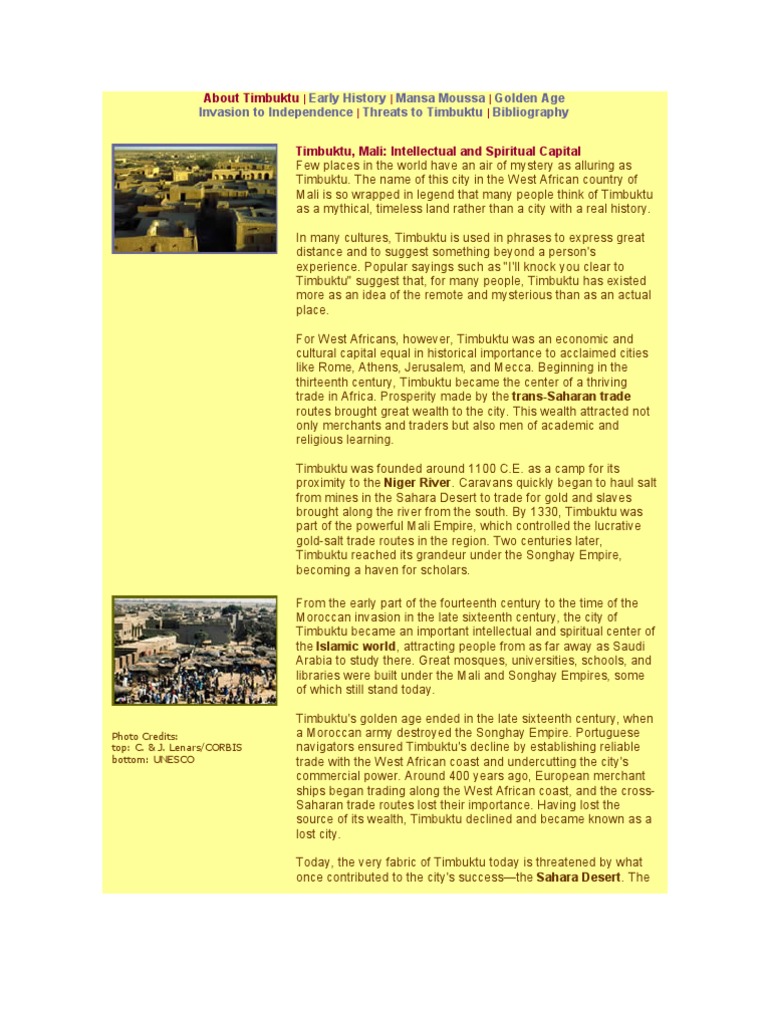 About Timbuktu | Early History | Mansa Moussa | Golden Age Invasion to Independence | Threats to Timbuktu | Bibliography
