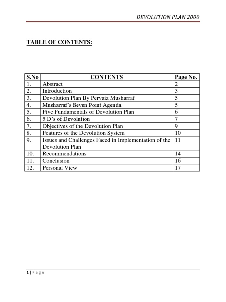Page No. Abstract 2 Introduction 3 Devolution Plan By Pervaiz Musharraf 5 Musharrafs Seven Point Agenda 5 Five Fundamentals of Devolution Plan 6 5 Ds of Devolution 7 Objectives of the Devolution Plan 9 Features of the Devolution System 10 Issues and Challenges Faced in Implementation of the 11 Devolution Plan Recommendations 14 Conclusion 16 Personal View 17