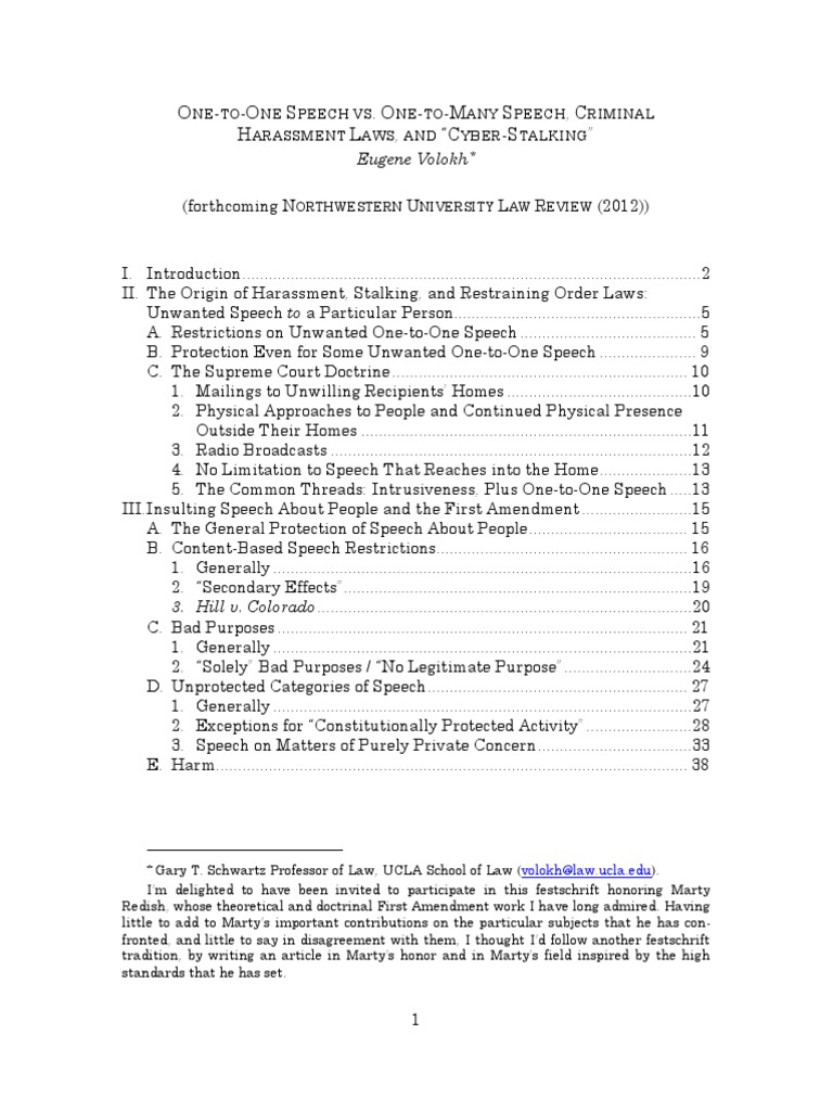 Gary T. Schwartz Professor of Law, UCLA School of Law (volokh@law.ucla.edu). Im delighted to have been invited to participate in this festschrift honoring Marty Redish, whose theoretical and doctrinal First Amendment work I have long admired. Having little to add to Martys important contributions on the particular subjects that he has confronted, and little to say in disagreement with them, I thought Id follow another festschrift tradition, by writing an article in Martys honor and in Martys field inspired by the high standards that he has set.