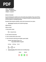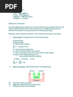 If this doesnt make sense to you, and another way does---PLEASE use the way you know. I am confident there are about 20 different ways to do these calculations. I sometimes use 2 ways just to make sure I get the same answer. Good way to double check! Many nurses are weak with drug calculations of all sorts. This article will help to review the major concepts related to drug calculations, help walk you through a few exercises, and provide a few exercises you can perform on your own to check your skills. There are many reference books available to review basic math skills, if you find that you have difficulty with even the basic conversion exercises. Common Conversions: 1 Liter = 1000 Milliliters 1 Gram = 1000 Milligrams 1 Milligram = 1000 Micrograms 1 Kilogram = 2.2 pounds Methods of Calculation Any of the following three methods can be used to perform drug calculations. Please review all three methods and select the one that works for you. It is important to practice the method that you prefer to become proficient in calculating drug dosages. Remember: Before doing the calculation, convert units of measurement to one system. I. Basic Formula: Frequently used to calculate drug dosages. D (Desired dose) H (Dose on hand) V (Vehicle-tablet or liquid) D x V = Amount to Give H D = dose ordered or desired dose H = dose on container label or dose on hand V = form and amount in which drug comes (tablet, capsule, liquid) Example: Order-Dilantin 50 mg p.o. TID Drug available-Dilantin 125 mg/5ml D=50 mg H=125 mg V=5 ml