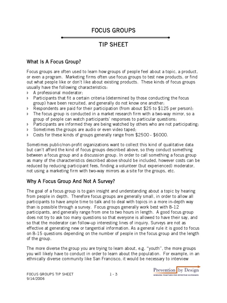 Focus groups are often used to learn how groups of people feel about a topic, a product, or even a program. Marketing firms often use focus groups to test new products, or find out what people like or dont like about existing products. These kinds of focus groups usually have the following characteristics: A professional moderator; Participants that fit a certain criteria (determined by those conducting the focus group) have been recruited, and generally do not know one another; Respondents are paid for their participation (from about $25 to $125 per person); The focus group is conducted in a market research firm with a two-way mirror, so a group of people can watch participants responses to particular questions; Participants are informed they are being watched by others who are not participating; Sometimes the groups are audio or even video taped; Costs for these kinds of groups generally range from $2500 - $6000. Sometimes public/non-profit organizations want to collect this kind of qualitative data but cant afford the kind of focus groups described above, so they conduct something between a focus group and a discussion group. In order to call something a focus group as many of the characteristics described above should be included, however costs can be reduced by reducing participant fees, finding a volunteer (but experienced) moderator, not using a marketing firm with two-way mirrors as a site for the groups, etc.