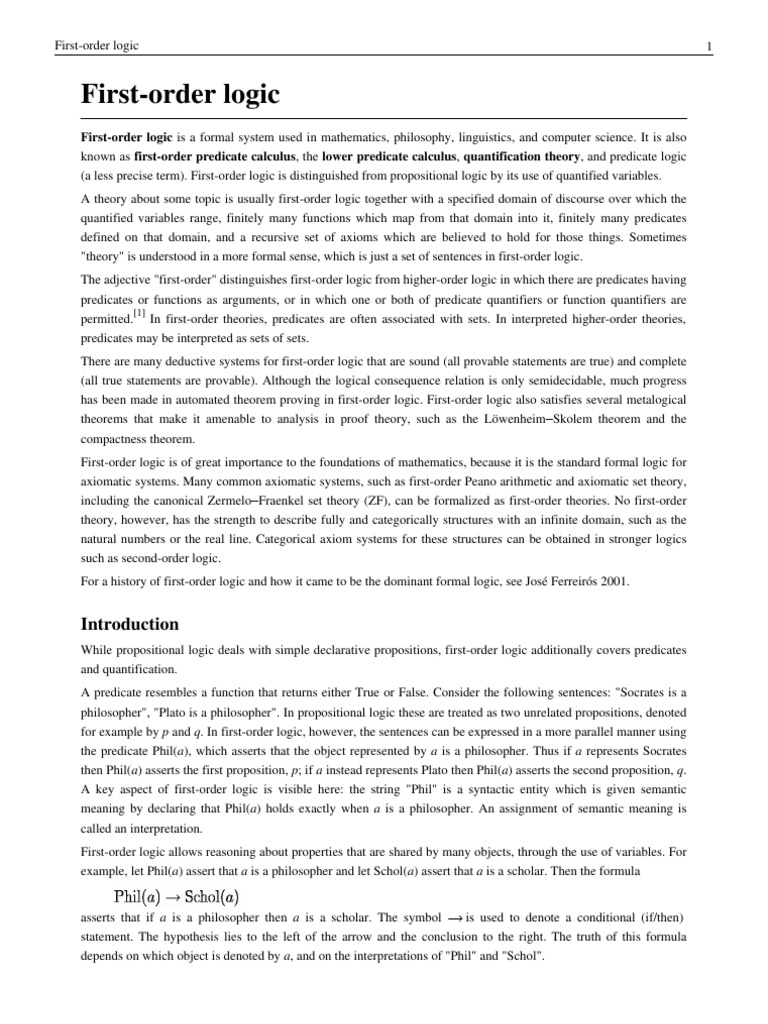 First-order logic is a formal system used in mathematics, philosophy, linguistics, and computer science. It is also known as first-order predicate calculus, the lower predicate calculus, quantification theory, and predicate logic (a less precise term). First-order logic is distinguished from propositional logic by its use of quantified variables. A theory about some topic is usually first-order logic together with a specified domain of discourse over which the quantified variables range, finitely many functions which map from that domain into it, finitely many predicates defined on that domain, and a recursive set of axioms which are believed to hold for those things. Sometimes "theory" is understood in a more formal sense, which is just a set of sentences in first-order logic. The adjective "first-order" distinguishes first-order logic from higher-order logic in which there are predicates having predicates or functions as arguments, or in which one or both of predicate quantifiers or function quantifiers are permitted.[1] In first-order theories, predicates are often associated with sets. In interpreted higher-order theories, predicates may be interpreted as sets of sets. There are many deductive systems for first-order logic that are sound (all provable statements are true) and complete (all true statements are provable). Although the logical consequence relation is only semidecidable, much progress has been made in automated theorem proving in first-order logic. First-order logic also satisfies several metalogical theorems that make it amenable to analysis in proof theory, such as the LwenheimSkolem theorem and the compactness theorem. First-order logic is of great importance to the foundations of mathematics, because it is the standard formal logic for axiomatic systems. Many common axiomatic systems, such as first-order Peano arithmetic and axiomatic set theory, including the canonical ZermeloFraenkel set theory (ZF), can be formalized as first-order theories. No first-order theory, however, has the strength to describe fully and categorically structures with an infinite domain, such as the natural numbers or the real line. Categorical axiom systems for these structures can be obtained in stronger logics such as second-order logic. For a history of first-order logic and how it came to be the dominant formal logic, see Jos Ferreirs 2001.