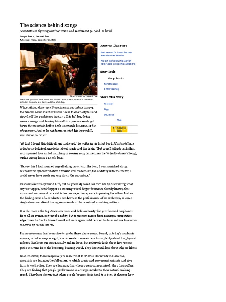 "At first I found this difficult and awkward," he writes in his latest book, Musicophilia, a collection of clinical anecdotes about music and the brain. "But soon I fell into a rhythm, accompanied by a sort of marching or rowing song (sometimes the Volga Boatmen's Song), with a strong heave on each beat. "Before this I had muscled myself along; now, with the beat, I was musicked along. Without this synchronization of music and movement, the auditory with the motor, I could never have made my way down the mountain." Rescuers eventually found him, but he probably saved his own life by discovering what any toe-tapper, head-bopper or steering-wheel finger-drummer already knows, that music and movement co-exist in human experience, each improving the other. Just as the flailing arms of a conductor can harness the performance of an orchestra, so can a single drummer direct the leg movements of thousands of marching soldiers. It is the reason the top American track and field authority this year banned earphones from all its events, not just for safety, but to prevent racers from gaining a competitive edge. Even Dr. Sacks himself could not walk again until he tried to do so in time to a violin concerto by Mendelssohn. But neuroscience has been slow to probe these phenomena. Sound, in today's academic science, is not as sexy as sight, and so modern researchers know plenty about the physical reflexes that keep our vision steady and in focus, but relatively little about how we can pick out a tune from the booming, buzzing world. They know still less about why we like it. Now, however, thanks especially to research at McMaster University in Hamilton, scientists are learning the full extent to which music and movement animate and give form to each other. They are learning that where one is compromised, the other suffers. They are finding that people prefer music in a tempo similar to their natural walking speed. They have shown that when people bounce their head to a beat, it changes how they hear a piece of music. And they are moving ever closer to demonstrating that the