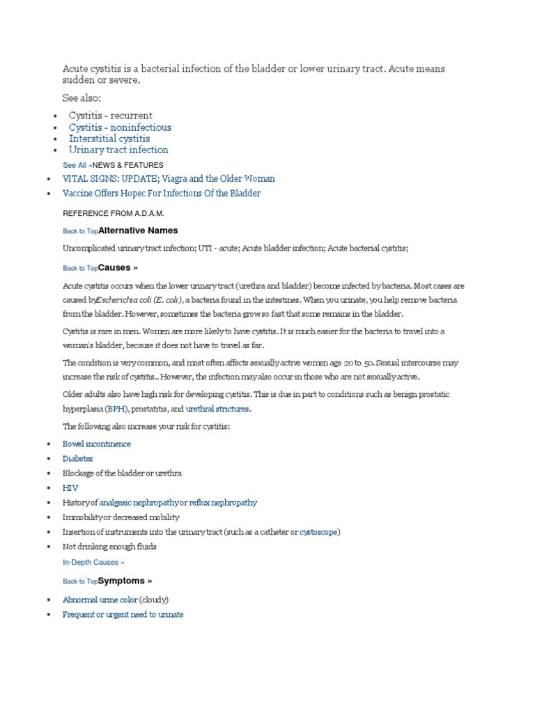 Acute cystitis occurs when the lower urinary tract (urethra and bladder) become infected by bacteria. Most cases are caused byEscherichia coli (E. coli), a bacteria found in the intestines. When you urinate, you help remove bacteria from the bladder. However, sometimes the bacteria grow so fast that some remains in the bladder. Cystitis is rare in men. Women are more likely to have cystitis. It is much easier for the bacteria to travel into a woman's bladder, because it does not have to travel as far. The condition is very common, and most often affects sexually active women age 20 to 50. Sexual intercourse may increase the risk of cystitis.. However, the infection may also occur in those who are not sexually active. Older adults also have high risk for developing cystitis. This is due in part to conditions such as benign prostatic hyperplasia (BPH), prostatitis, and urethral strictures. The following also increase your risk for cystitis: